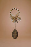 The Blessing Saint Benito Medallion with pearls is a meaningful home blessing and pendant designed to bring prosperity and protection. Featuring a circle of elegant pearls as the hanger and a versatile beige bow, it complements any setting or gift occasion. This medallion honors Saint Benito, offering a spiritual touch that enhances your home’s atmosphere with faith and grace. Ideal for gifting or personal use, it combines tradition with refined aesthetics to enrich your space with blessings. Handmade.
